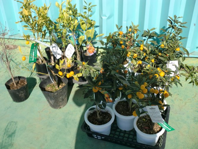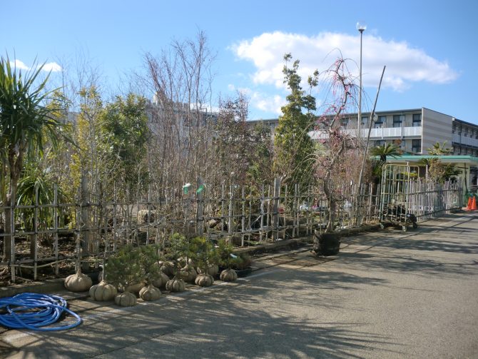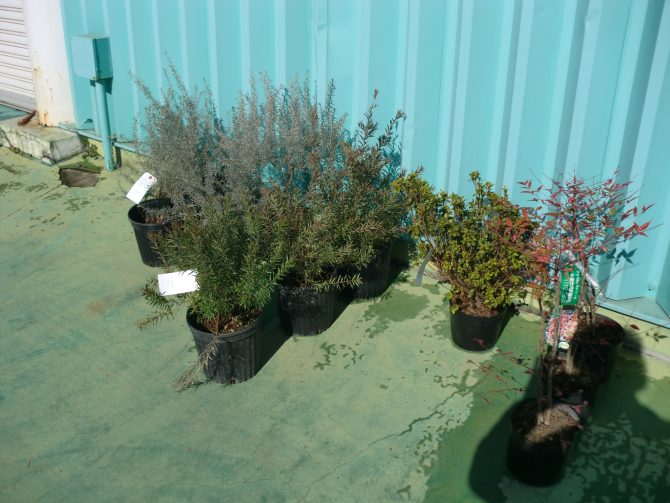 ガクアジサイ(青)、紅孔雀松、黒松苗、青枝垂、赤枝垂、クレハ、グレビリアプーリンダイルミナ、グレビリアジョンエバンス、久留米ツツジ(白花)、南天(赤実) ドウダンツツジ、金柑、温州みかん、まるまる金柑